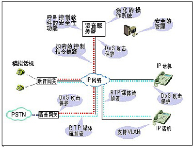 IP電話的各個(gè)組成部分從語(yǔ)音服務(wù)器、語(yǔ)音網(wǎng)關(guān)到IP電話都能夠?qū)oS攻擊具有相應(yīng)的保護(hù)功能: