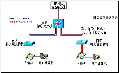 目前各個(gè)廠商的系列IP話機(jī)均提供2個(gè)以太網(wǎng)端口,一個(gè)連接網(wǎng)絡(luò)交換機(jī),一個(gè)可以連接用戶PC,與網(wǎng)絡(luò)交換機(jī)連接端口支持802.1Q/p,可以實(shí)現(xiàn)IP語(yǔ)音和用戶PC劃歸不同的VLAN,而且IP語(yǔ)音包會(huì)帶上第二層和第三層的優(yōu)先級(jí)標(biāo)記,可以和客戶具有QoS支持的數(shù)據(jù)網(wǎng)絡(luò)平臺(tái)結(jié)合,提高IP話音質(zhì)量。