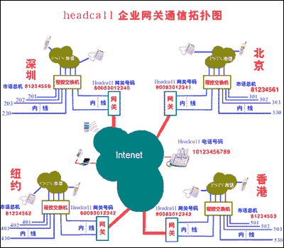 下面是集團用戶利用HeadCall的語音網(wǎng)關(guān)的通訊拓樸圖: