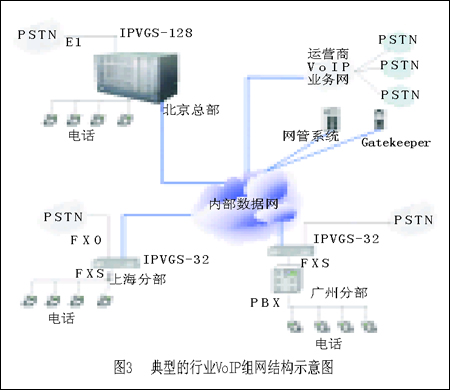 我國(guó)現(xiàn)有很多擁有自己專網(wǎng)的行業(yè),比如金融、能源和一些政府機(jī)構(gòu),它們正是通過(guò)這樣的方案來(lái)實(shí)現(xiàn)內(nèi)部通話的。這些行業(yè)目前也正是中國(guó)VoIP市場(chǎng)的主力,由于行業(yè)用戶的規(guī)模很大,目前中國(guó)的很多行業(yè)實(shí)際上都有一套運(yùn)營(yíng)級(jí)的VoIP網(wǎng)絡(luò)。圖3是一個(gè)典型的行業(yè)VoIP組網(wǎng)結(jié)構(gòu)圖。