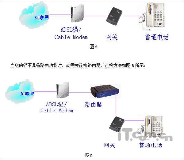 網(wǎng)關(guān)聯(lián)接至RJ45網(wǎng)線,普通電話機聯(lián)接在PHONE端口,該網(wǎng)關(guān)可通過市話線路或網(wǎng)絡撥打電話,原有市話線聯(lián)接在PSTN口上,直撥號碼時為通過網(wǎng)絡撥打,加前置碼#0*通過原有市話線撥打,如停電,所有電話均自動從原有市話線路撥出。