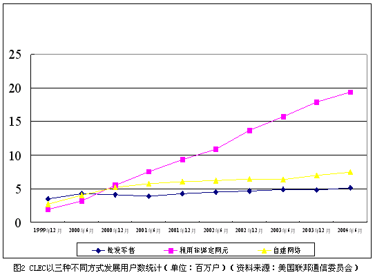 從經(jīng)營模式上看,本地非主導(dǎo)運(yùn)營商的商業(yè)模式在過去的5年中發(fā)生了很大變化。在市場剛剛開始引入競爭的1999年,42.9%的本地非主導(dǎo)運(yùn)營商選擇了批發(fā)零售這種進(jìn)入門檻相對較低的商業(yè)模式,本地電話市場一度活躍著大量地區(qū)性的小運(yùn)營商。由于面臨本地主導(dǎo)運(yùn)營商的強(qiáng)烈抵制,非綁定網(wǎng)元政策的實(shí)施自公布以來一再推遲,經(jīng)過反復(fù)的法律訴訟,美國最高法院在2002年最終裁定非綁定網(wǎng)元政策合法。自那時起,AT&T、MCI等全國性的長途電話運(yùn)營商紛紛通過租用非綁定網(wǎng)元的方式進(jìn)入本地電話市場。截止到2004年6月,本地主導(dǎo)運(yùn)營商已經(jīng)提供了約2150萬線非綁定本地用戶線給本地非主導(dǎo)運(yùn)營商。CLEC以三種方式發(fā)展用戶的情況如圖2所示。