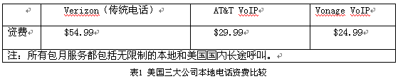 隨著寬帶接入的進(jìn)一步普及,VoIP似乎為打破本地環(huán)路的瓶頸提供了新的選擇,AT&T、Qwest、時代華納、Verizon等老牌運(yùn)營商紛紛開始提供這項(xiàng)服務(wù)。AT&T于2004年3月在新澤西州和德克薩斯州推出了29.99美元的包月計劃,其VoIP業(yè)務(wù)不僅包含了基本語音服務(wù),也提供諸如呼叫轉(zhuǎn)移、會議電話、來電顯示等增值服務(wù),美國三大公司本地電話資費(fèi)如表1所示。