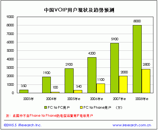 中國VOIP市場(chǎng)上PC to PC的VOIP電話主要是通過即時(shí)通訊軟件和語音聊天室來實(shí)現(xiàn)的,目前這部分服務(wù)絕大多數(shù)是免費(fèi)的,尚未給服務(wù)公司帶來直接的經(jīng)濟(jì)收入。根據(jù)iResearch的統(tǒng)計(jì)數(shù)據(jù),2004年中國PC to PC的VOIP電話用戶達(dá)到1900萬,2005年有望達(dá)到2900萬。由于信息產(chǎn)業(yè)部在2003年2月發(fā)布的《電信業(yè)務(wù)分類目錄》中規(guī)定IP電話屬于第一類基礎(chǔ)電信業(yè)務(wù),但“IP電話業(yè)務(wù)在此特指由電話網(wǎng)絡(luò)和IP網(wǎng)絡(luò)共同提供的Phone-Phone以及PC-Phone的電話業(yè)務(wù)”,這與目前虛擬運(yùn)營的Phone to Phone 、PC to Phone的寬帶電話略有不同,盡管如此這一規(guī)定對(duì)提供Phone to Phone 和PC to Phone的非電信運(yùn)營商有著非常大的制約,目前在我國提供“到電話”的VOIP服務(wù)除部分基礎(chǔ)電信運(yùn)營商試驗(yàn)外多為暗中操作,存在較大的風(fēng)險(xiǎn)不能通過大規(guī)模的市場(chǎng)推廣來迅速吸引用戶,因此PC to Phone的VOIP電話用戶增長速度將相對(duì)平穩(wěn),據(jù)iResearch預(yù)測(cè),2008年中國的PC to Phone的VOIP電話用戶將達(dá)到2800萬戶。