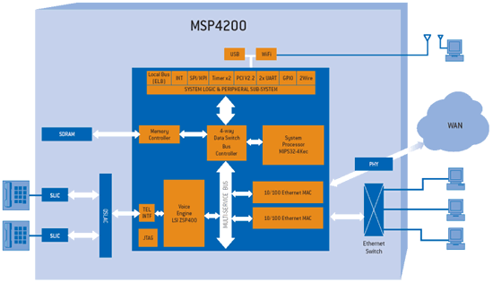 PMC-Sierra經(jīng)過(guò)現(xiàn)場(chǎng)驗(yàn)證的語(yǔ)音處理模塊(VPN)可以在整個(gè)MSP產(chǎn)品系列得到支持,不管是低成本ATA還是高性能CPE寬帶路由器和網(wǎng)關(guān)方案都可以提供運(yùn)營(yíng)商級(jí)PSTN質(zhì)量的VoIP服務(wù)。