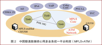 中國聯(lián)通IP電話網(wǎng)的承載網(wǎng)分為核心層和區(qū)域?qū)觾杉壗Y(jié)構(gòu),核心層由北京、上海、廣州、沈陽、武漢、西安和成都7個大區(qū)節(jié)點(diǎn)組成;區(qū)域?qū)影锤鞣止緟^(qū)域分布情況,劃分為22個區(qū)域。建網(wǎng)初期,承載網(wǎng)采用ATM+IP/VPN組成IP電話專用傳輸網(wǎng),確保IP承載層的QoS,網(wǎng)絡(luò)性能符合聯(lián)通測試指標(biāo)。下一階段,中國聯(lián)通數(shù)據(jù)核心網(wǎng)的技術(shù)演進(jìn)路線方向如圖2所示。網(wǎng)絡(luò)將以MPLS+ATM為核心技術(shù),在7大核心節(jié)點(diǎn)建設(shè)功能強(qiáng)大的MPLS核心網(wǎng)絡(luò),同時采用2層MPLS技術(shù),實(shí)現(xiàn)與ATM設(shè)備的透明連接,從而構(gòu)建一個多協(xié)議、多業(yè)務(wù)同時兼顧IPv4/IPv6發(fā)展的先進(jìn)網(wǎng)絡(luò)。中國聯(lián)通的互聯(lián)網(wǎng)、數(shù)據(jù)專線、IP電話、視頻會議、IPv6網(wǎng)絡(luò)、CDMA1X數(shù)據(jù)通信網(wǎng)等都承載在統(tǒng)一的數(shù)據(jù)傳送平臺之上。