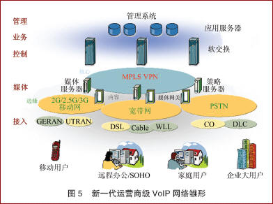 隨著以軟交換和MPLS/VPN兩項(xiàng)技術(shù)為核心的下一代網(wǎng)絡(luò)技術(shù)的不斷成熟和發(fā)展,將構(gòu)筑起新一代運(yùn)營商級的VoIP網(wǎng)絡(luò)雛形,如圖5所示。