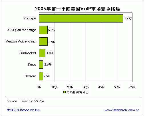 iResearch艾瑞市場(chǎng)咨詢根據(jù)美國(guó)融合通信和移動(dòng)通信行業(yè)市場(chǎng)調(diào)查公司Telephia統(tǒng)計(jì)數(shù)據(jù)顯示,在純VoIP服務(wù)市場(chǎng)上,Vonage公司擁有53.9%的市場(chǎng)份額,在市場(chǎng)份額排名上仍位居第一。并列第二位的有兩個(gè)公司,為Verizon Voice Wing公司和AT&T Call Vantage公司,市場(chǎng)份額均為5.5%,隨后的是SunRocket市場(chǎng)份額4%,Lingo2.6%,和NetZero Voice2.5%。
