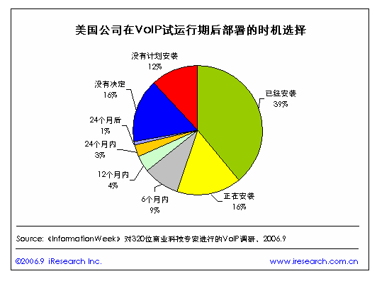 iResearch艾瑞市場咨詢整理《InformationWeek》對320位商業(yè)科技專家進行的VoIP調研數據顯示,美國有近四成的公司在VoIP試運行期后安裝了VoIP,正在安裝的也達到了一成以上,打算在6個月以內安裝的有近一成。