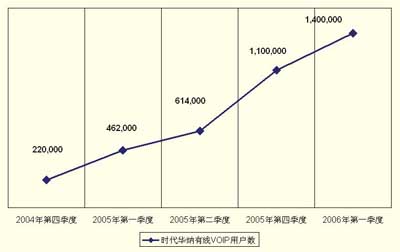 很快時代華納有線的VoIP業(yè)務(wù)就出現(xiàn)了強勁的增長,2005年的頭幾個月,其VoIP用戶數(shù)以幾乎每周1萬的速度增加,到2005年第二季度,時代華納有線就成為全美第二大VoIP提供商。圖1描述了時代華納有線從2004年到2006年初的VoIP客戶強勁增長。