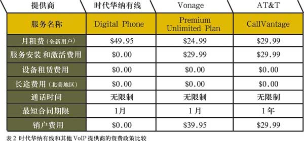 聲稱其1/3的有線電視用戶和一半以上的寬帶用戶訂購了其提供的VoIP服務(wù)。對于時代華納有線的全新VoIP用戶來說,開通并使用“數(shù)字電話”的費用為每月49.95美元,那些時代華納有線的寬帶用戶只需44.95美元,如果用戶同時使用有線電視和寬帶,那么只需要39.95美元就可以了,時代華納有線為所有的服務(wù)(視頻、語音和數(shù)據(jù)接入)提供每月統(tǒng)一的賬單。此外用戶使用“數(shù)字電話”不需要簽訂長期合同,并享有30天的試用期,相對于其競爭對手來說賦予了用戶更多的自由。