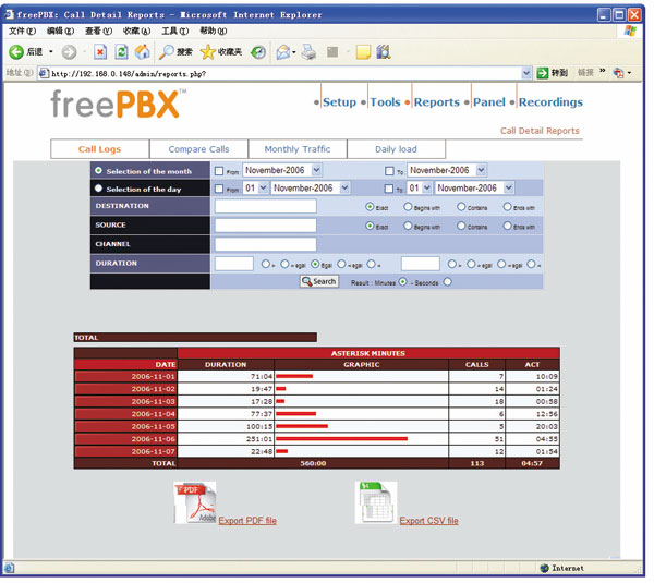 使用Trixbox的統(tǒng)計(jì)報(bào)告功能(如圖5所示),用戶能夠察看在一個(gè)時(shí)間段內(nèi)的通話統(tǒng)計(jì)數(shù)據(jù),例如呼叫建立總數(shù)、呼叫平均時(shí)長、失敗呼叫比例等等,當(dāng)然也能夠察看每個(gè)呼叫的主叫/被叫號(hào)碼,以及呼叫發(fā)生的具體時(shí)間。