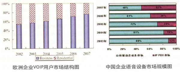 相關數(shù)據(jù)顯示,企業(yè)級VOIP的市場規(guī)模將以超過40%的年復合增長率增長,2010年前仍將占據(jù)整個VOIP市場的50%以上。從“歐洲VOIP用戶市場結構圖”來看,企業(yè)VOIP用戶的占比在逐年提升,2007年可達到70%左右。全球企業(yè)VOIP的設備銷售形勢也是一片大好,Juniper Research最新發(fā)表的研究報告稱,2007年企業(yè)VOIP設備市場的銷售收入將達到55億美元。