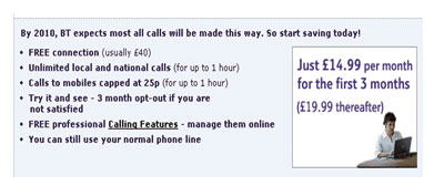 BTBroadbandTalk產(chǎn)品在其套餐使用費中包括了一定時段的免費國內(nèi)時長,國際長途按照通話量另外收取。VoIP通話所需要的寬帶電話設備由BT免費提供給客戶。