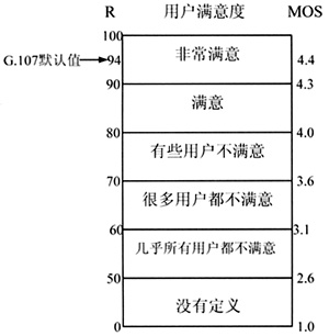在ITU-T P.800中規(guī)定的平均主觀值MOS,基于該主觀評測把人接聽和感知語音質(zhì)量的行為被調(diào)研和量化,接聽到何種級別質(zhì)量的語音,就得到多少平均主觀值MOS。一般情況下MOS值是4或更高被認(rèn)為是比較好的語音質(zhì)量,而若平均主觀值MOS低于3.6,則大部分接聽者不能滿意語音質(zhì)量。平均主觀測試雖然準(zhǔn)確有效,但是這種方法存在的最大問題就是實現(xiàn)起來非常麻煩和昂貴,因此人們在不斷地探索能進行客觀測量的方法。ITU-T的G.107標(biāo)準(zhǔn)提出的E模型考慮了延時、噪聲、回音、編碼器性能、丟包、抖動等網(wǎng)絡(luò)損傷因素對語音質(zhì)量的影響。它的評價標(biāo)準(zhǔn)如圖1所示。