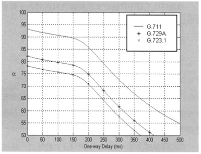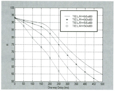 Datagram Protocol)協(xié)議進行傳輸[1]。近年來,隨著IP網(wǎng)絡(luò)技術(shù)的廣泛應(yīng)用,VoIP成為一種新興的電話通信方式,IP網(wǎng)絡(luò)所提供的語音質(zhì)量問題受到人們的普遍關(guān)注,如何對語音質(zhì)量進行科學(xué)可靠的測量和評價是網(wǎng)絡(luò)測量和網(wǎng)絡(luò)規(guī)劃設(shè)計中十分關(guān)鍵的問題。E-Model作為語音質(zhì)量測量的一種新方法,它適合數(shù)據(jù)網(wǎng)絡(luò)的語音質(zhì)量測量,必將有廣泛的應(yīng)用。本文將在E模型下分析延時、噪聲、回音和語音壓縮等對VoIP語音質(zhì)量的影響。