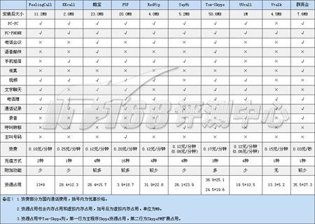 單獨(dú)安裝每一個(gè)軟件到測(cè)試系統(tǒng)中,查看文件大小。注冊(cè)帳號(hào),順序測(cè)試軟件的每項(xiàng)功能,包括語(yǔ)音、視頻、文本及附加功能;在效果測(cè)試部分,測(cè)試每一個(gè)軟件PC-PHONE的語(yǔ)音效果,分別撥打固定電話及移動(dòng)電話,測(cè)試兩端的語(yǔ)音效果。性能測(cè)試部分為記錄每款軟件在運(yùn)行時(shí)的系統(tǒng)資源占用情況,包括內(nèi)存使用和虛擬內(nèi)存大小兩部分。