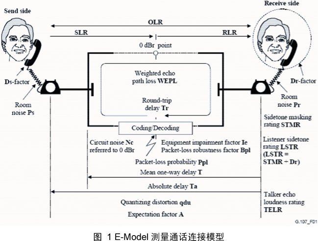 E-Model是基于如下通話連接模型進行測量的(見圖1),其最終的測量結(jié)果就是得到R值(R Factor),被稱為全面的網(wǎng)絡(luò)傳輸?shù)燃壱,也就是說,確定包含話音通道的“由口至耳”特性的“R”因素。R因素的取值范圍為0~120,窄帶電話上R因素通常取50~94,而寬帶電話上R取值在50~110。R因素的值可以轉(zhuǎn)換為會話和收聽質(zhì)量MOS得分(MOSCQ