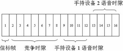 根據(jù)設(shè)計(jì)的特點(diǎn),無(wú)線(xiàn)語(yǔ)音網(wǎng)關(guān)同手持設(shè)備間的無(wú)線(xiàn)網(wǎng)絡(luò)采用星型拓?fù)浣Y(jié)構(gòu),無(wú)線(xiàn)語(yǔ)音網(wǎng)關(guān)作為無(wú)線(xiàn)個(gè)域網(wǎng)的協(xié)調(diào)器同手持設(shè)備進(jìn)行信息交互。IEEE802.15.4MAC層分為使用信標(biāo)幀和不使用信標(biāo)幀兩種工作模式,本設(shè)計(jì)采用使用信標(biāo)幀同步的超幀結(jié)構(gòu),由無(wú)線(xiàn)語(yǔ)音網(wǎng)關(guān)發(fā)送信標(biāo)幀同步無(wú)線(xiàn)手持設(shè)備的數(shù)據(jù)傳輸。本設(shè)計(jì)中超幀長(zhǎng)30ms,等分為16個(gè)時(shí)隙,每個(gè)時(shí)隙為1.875ms。信標(biāo)幀在時(shí)隙1發(fā)送,時(shí)隙2到時(shí)隙8為競(jìng)爭(zhēng)時(shí)隙,使用時(shí)隙CSMA-CA算法傳輸命令幀和應(yīng)答幀。時(shí)隙9到時(shí)隙16固定分配給兩個(gè)手持設(shè)備作為上下行語(yǔ)音數(shù)據(jù)通道。上下行各兩個(gè)時(shí)隙的分配可以滿(mǎn)足經(jīng)