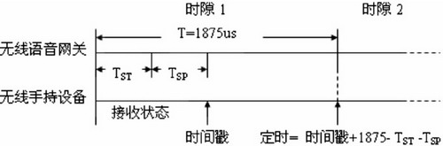 時(shí)隙1開(kāi)始后,語(yǔ)音網(wǎng)關(guān)需要TSTms的時(shí)間將射頻芯片從空閑狀態(tài)轉(zhuǎn)換為發(fā)送狀態(tài),當(dāng)轉(zhuǎn)換為發(fā)送狀態(tài)后,預(yù)先存儲(chǔ)在射頻芯片發(fā)送RAM中的信標(biāo)幀立即開(kāi)始發(fā)送,手持設(shè)備上的射頻芯片在收到六個(gè)字節(jié)TSPms后自動(dòng)鎖存一個(gè)當(dāng)前時(shí)間timestamp(時(shí)間戳),