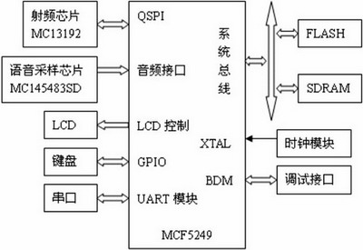除內(nèi)核外,完整的操作系統(tǒng)還需要編寫(xiě)鍵盤(pán),LCD,音頻驅(qū)動(dòng)和射頻芯片驅(qū)動(dòng)。音頻驅(qū)動(dòng)采用Phlips I2S數(shù)據(jù)格式,設(shè)定采樣率為8KHz。射頻芯片驅(qū)動(dòng)采用Freescale公司為MC13192提供的配套軟件模塊。