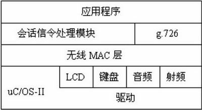 操作系統(tǒng)之上是無(wú)線(xiàn)MAC層,該模塊針對(duì)語(yǔ)音無(wú)線(xiàn)傳輸?shù)奶攸c(diǎn)簡(jiǎn)化實(shí)現(xiàn)了IEEE 802.15.4 協(xié)議MAC層功能。第三層為語(yǔ)音壓縮編解碼g.726模塊和無(wú)線(xiàn)網(wǎng)內(nèi)部會(huì)話(huà)信令處理模塊。會(huì)話(huà)信令處理模塊負(fù)責(zé)處理來(lái)自無(wú)線(xiàn)語(yǔ)音網(wǎng)關(guān)的會(huì)話(huà)信令。最上層為應(yīng)用層,實(shí)現(xiàn)用戶(hù)界面和通話(huà)過(guò)程控制。無(wú)線(xiàn)手持設(shè)備總統(tǒng)框架如圖6所示。
