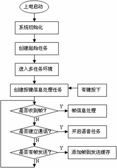 當(dāng)手持設(shè)備上電啟動(dòng)后,其工作流程如圖7示。首先進(jìn)行的是系統(tǒng)的初始化,包括處理器初始化,操作系統(tǒng)mC/OS-II初始化,LCD,鍵盤(pán),射頻模塊等的初始化。之后建立起始任務(wù)并通過(guò)OSStart()函數(shù)進(jìn)入多任務(wù)環(huán)境。此時(shí)起始任務(wù)占用CPU資源,在起始任務(wù)中,建立按鍵信息處理任務(wù)并通過(guò)信號(hào)量機(jī)制掛起。然后判斷是否收到來(lái)自無(wú)線(xiàn)語(yǔ)音網(wǎng)關(guān)的幀,如果有,調(diào)用frame_deal()函數(shù)處理幀信息,在該函數(shù)中調(diào)用call_command_deal()完成無(wú)線(xiàn)網(wǎng)內(nèi)部會(huì)話(huà)信令的處理。接著判斷通話(huà)是否建立,如果建立則創(chuàng)建語(yǔ)音任務(wù),在語(yǔ)音進(jìn)程中使能PCM編解碼芯片,并進(jìn)行g(shù).726壓縮編碼。最后判斷是否有幀需要發(fā)送給無(wú)線(xiàn)語(yǔ)音網(wǎng)關(guān),如果有則把幀添加到發(fā)送緩存,等待發(fā)送時(shí)隙到來(lái)。這一過(guò)程完成以后重新跳到判斷是否收到來(lái)自無(wú)線(xiàn)語(yǔ)音網(wǎng)關(guān)的幀,重復(fù)以上過(guò)程。如果有鍵盤(pán)中斷,將會(huì)釋放一個(gè)信號(hào)量,該信號(hào)量將解掛按鍵信息處理任務(wù)。該任務(wù)對(duì)鍵盤(pán)輸入信息進(jìn)行處理。