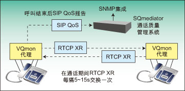 圖2顯示了如何在IP網(wǎng)絡(luò)上使用行業(yè)標(biāo)準(zhǔn)覆蓋質(zhì)量管理系統(tǒng)。圖中顯示了嵌入式軟件探測裝置,如IP話機(jī)中的行業(yè)標(biāo)準(zhǔn)VQMon代理,它們可實(shí)時監(jiān)測通話質(zhì)量。這些代理可生成RTCP