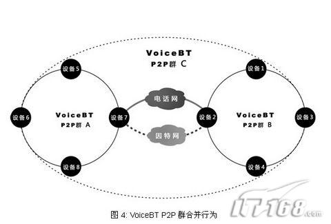 純P2P是采用分布式信息共享技術(shù)實現(xiàn)的無服務(wù)器網(wǎng)絡(luò)體系結(jié)構(gòu),VoiceBT P2P群是一個采用純P2P技術(shù)并由所有callfreee設(shè)備自發(fā)組成的智能P2P網(wǎng)絡(luò),電話線交互IP定位信息技術(shù)不但可以使網(wǎng)絡(luò)不需要服務(wù)器而且能夠極大的加快網(wǎng)絡(luò)收斂速度和增強(qiáng)網(wǎng)絡(luò)穩(wěn)定性。VoiceBT P2P群基本行為分為合并和查詢兩種。本文用圖例的方式簡要的介紹一下這兩種行為。