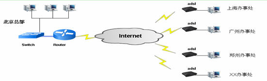 數(shù)據(jù)網(wǎng)絡:各地辦事處通過ADSL接入Internet,構建在Internet上與總部互通的寬帶網(wǎng)絡。