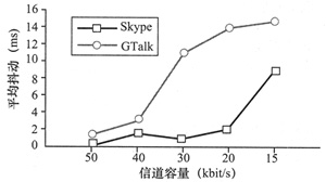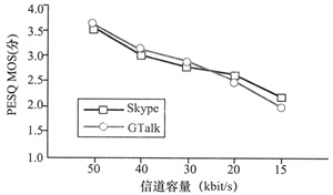 MOS(見圖3),發(fā)現(xiàn)在信道容量為50 kbit/s時GTalk利用了更多的帶寬,傳輸速率比Skype更高。當信道容量變?yōu)?0