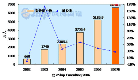 從圖中可以看出,中國的寬帶用戶數(shù)保持了快速的發(fā)展勢頭,從2002-2007年年均增長率為58.7%,至2007年,國內的寬帶用戶數(shù)將達到6640.1萬。