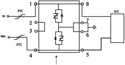 FXS要求SLIC保護器能夠?qū)⒍嘤嗟睦擞哭D(zhuǎn)移到SLIC T/R線路中。這是利用P1101DF-1的單向特性完成的。線路中出現(xiàn)的正浪涌將被反并聯(lián)二極管轉(zhuǎn)移到SIDACtor