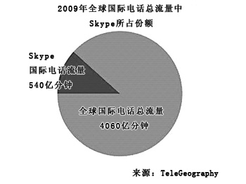 盡管全球的國(guó)際長(zhǎng)途電話呼叫量增長(zhǎng)在減緩,但是Skype的業(yè)務(wù)量卻急劇上升。2008年,Skype網(wǎng)內(nèi)用戶間的國(guó)際長(zhǎng)途呼叫量的增幅高達(dá)51%,2009年這一增幅達(dá)到63%,達(dá)到540億分鐘。如今,Skype已經(jīng)成為全球最大的跨境通話服務(wù)提供商。