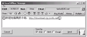 其它功能 支持界面更換,支持快捷鍵操作,可通過PtoP的方式傳送文件,支持語音交流,POP3新郵件檢查,支持直接向好友的手機發(fā)送短消息,傳呼等。
