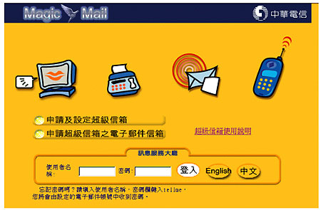 使用Internet瀏覽器的用戶可以通過中華電信超級信箱的專用網(wǎng)頁來接入。當(dāng)然,您需要輸入使用名和密碼。