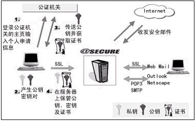 簡(jiǎn)單來說,PKI就是由發(fā)布機(jī)構(gòu)發(fā)布證書給PKI的用戶,證書中含有用戶公共密鑰和個(gè)人密鑰的信息,由證書、證書授權(quán)機(jī)構(gòu)CA和實(shí)體三部分組成。PKI的用戶利用個(gè)人密鑰簽發(fā)信息或解密收到的信息,而其他用戶則使用對(duì)應(yīng)公共密鑰收發(fā)信息;赑KI的設(shè)計(jì),采用統(tǒng)一的證書分配、管理策略以及共同的可靠性驗(yàn)證機(jī)制,一方面可以保證E-mail的安全性,另一方面還可以解決現(xiàn)有不同系統(tǒng)無法進(jìn)行通信的弊病。因此,現(xiàn)有推出的一些優(yōu)秀E-mail系統(tǒng)如3R Soft推出的@SECURE都是基于PKI進(jìn)行設(shè)計(jì)的。通過數(shù)據(jù)加密的辦法只能保證郵件的機(jī)密性,卻無法完全保證郵件的完整性和不可抵賴性,即不能保證郵件在傳輸過程中不被他人篡改,且不被人冒名頂替發(fā)送。數(shù)字簽名可以有效地阻止這一現(xiàn)象,即在發(fā)送E-mail的同時(shí),加上一個(gè)Hash冗余信息。發(fā)送者使用Hash函數(shù)創(chuàng)建信息的摘要,作為信息數(shù)字指紋,然后用個(gè)人密鑰加密信息摘要,加密后的信息摘要就是數(shù)字指紋。目前較為常用的,如在 @SECURE 中采用的MD5算法,它是一種單向散列算法,大小為128比特,經(jīng)計(jì)算,它被仿制的概率小于1/265,符合安全性的需要。