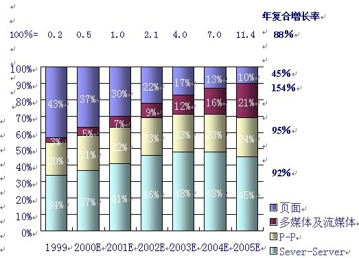 同時,人們對P-P的互動及多媒體的傳輸?shù)男枨髮⒊蔀榫W(wǎng)絡(luò)使用的2個最主要的發(fā)展趨勢。據(jù)麥肯錫公司和JP摩根的分析和預(yù)測,多媒體及流媒體的IP流量將以每年154%的復(fù)合率增長,而P—P的IP流量將以95%的年復(fù)合增長率增長,這2項將成為用戶需求增長最快的業(yè)務(wù)。如下圖,