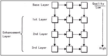 關(guān)于分層可擴(kuò)展性編碼的研究可以追溯到10年前,目前它已經(jīng)被許多現(xiàn)行的國際壓縮標(biāo)準(zhǔn)接納,例如H.263+和MPEG-4。分層可擴(kuò)展編碼主要有三種:時域可擴(kuò)展性、空域可擴(kuò)展性和質(zhì)量可擴(kuò)展性。其中質(zhì)量可擴(kuò)展性也稱為PSNR可擴(kuò)展性,原因是視頻質(zhì)量通常用峰值信噪比(PSNR)來衡量。