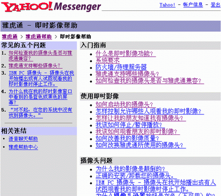 選擇工具->開啟我的攝像頭后,就會(huì)彈出“我的即時(shí)影像”窗口(圖4),如果你的攝像頭安裝連接正常,可以馬上從這個(gè)窗口中看到你的影像;如果你的攝像頭正常,但在窗口中卻沒有看到影像,你可以在聯(lián)網(wǎng)的情況下選擇當(dāng)前窗口中的幫助->即時(shí)影像幫助進(jìn)入相關(guān)網(wǎng)頁(圖5)對(duì)你的攝像頭進(jìn)行雅虎通的兼容性測試,或者尋求更為詳細(xì)的幫助。