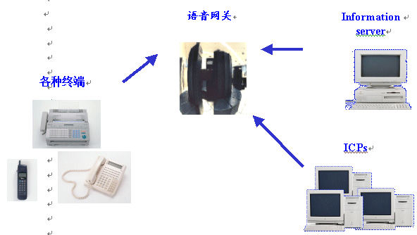 在這樣的體系結(jié)構(gòu)中,各種終端通過(guò)PSTN網(wǎng)絡(luò)聯(lián)接到語(yǔ)音網(wǎng)關(guān),而通過(guò)語(yǔ)音網(wǎng)關(guān)來(lái)訪問(wèn)后臺(tái)的數(shù)據(jù)服務(wù)、應(yīng)用服務(wù),或者通過(guò)互聯(lián)網(wǎng)絡(luò)訪問(wèn)各個(gè)語(yǔ)音ICP。