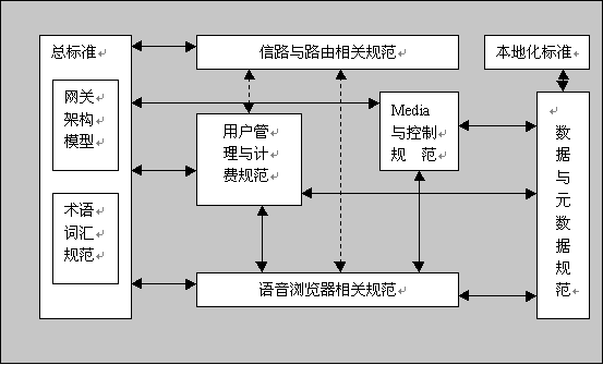 通過(guò)分析國(guó)際上各種語(yǔ)音網(wǎng)關(guān)系統(tǒng)極其技術(shù)規(guī)范,特別是參照 W3C組織的"Voice Browser" Activity的框架,我們認(rèn)為作為一個(gè)比較完整的語(yǔ)音網(wǎng)關(guān)標(biāo)準(zhǔn)體系,應(yīng)該包含以下具體標(biāo)準(zhǔn)規(guī)范的制定,通常稱(chēng)之為標(biāo)準(zhǔn)需求。下圖顯示所需的規(guī)范類(lèi)型及其相互關(guān)聯(lián)。