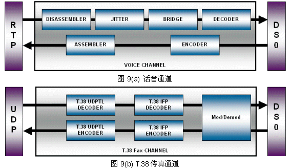 Fusion 提供了標(biāo)準(zhǔn)的MSPP通道類型以支持語聲編解碼和T.38傳真,且可由應(yīng)用程序按需調(diào)用接口函數(shù)創(chuàng)建單工或雙工通道來對(duì)數(shù)據(jù)進(jìn)行處理,其中雙工通道實(shí)際上包含兩條單工過濾器鏈組。