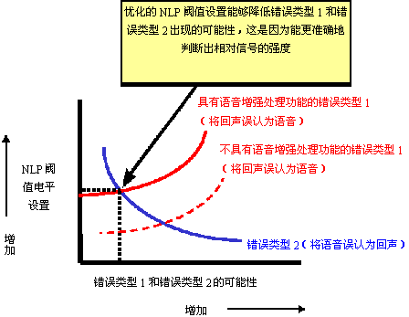 dB)能夠顯著降低將雙對(duì)話語(yǔ)音信號(hào)誤認(rèn)為聲學(xué)回聲信號(hào)的概率,從而防止了"錯(cuò)誤類型2"?傊,在"錯(cuò)誤類型1"(實(shí)線曲線,具有語(yǔ)音增強(qiáng)特性)和"錯(cuò)誤類型2"曲線的交叉點(diǎn)上,通過與之對(duì)應(yīng)的NLP設(shè)置,可以獲得最佳的性能(請(qǐng)參見圖10)。