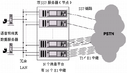 那兩個SS7節(jié)點是以冗余方式配置的,共享相同的信令點編碼,為所有的媒體節(jié)點提供呼叫控制。圖中所示的所有SS7鏈路采用單信令點編碼冗余方式備份,即使其中一個 SS7節(jié)點出現故障,信令系統(tǒng)仍能繼續(xù)為呼入提供不中斷的語音信箱訪問。