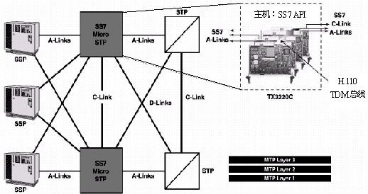 微型STP連接多條從SSP來的鏈路,并把它們集中到一個連接STP的鏈路集之中,這一鏈路集有兩條鏈路。微型STP到每個SSP也有兩條鏈路組成的一個鏈路集。微型STP由完全相同配置的一對構成,以實現高可用性和高可靠性,兩個STP之間用交叉鏈路(C鏈路)相連接。另外,微型STP上的每個端口可以設置一個唯一的信令點編碼,以便移除SS7鏈路時不影響端點SSP。