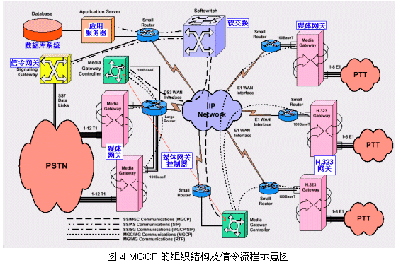 下面的圖4給出了MGCP協(xié)議體系中的邏輯組件、組織結(jié)構(gòu)和信令流圖。