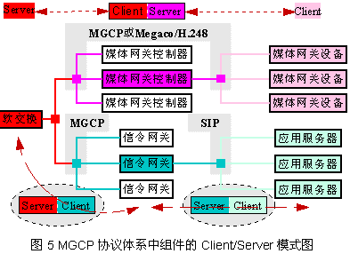 Gateway Controller)通過(guò)MGCP或Megaco/H.248構(gòu)成服務(wù)器/客戶端關(guān)系,而媒體網(wǎng)關(guān)控制器有作為服務(wù)器同樣通過(guò)MGCP等協(xié)議控制媒體網(wǎng)關(guān)設(shè)備(Media