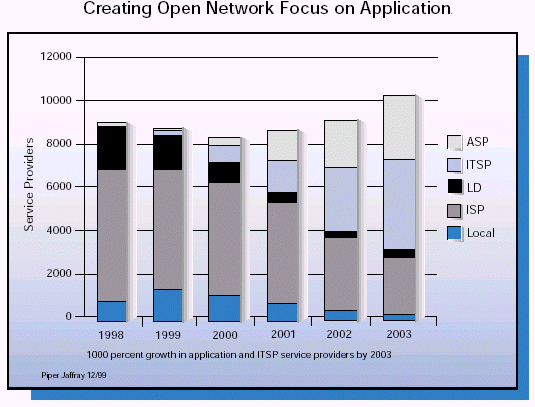 長(zhǎng)距離時(shí)間日漸商品化。業(yè)務(wù)提供商不斷地尋求更高價(jià)值的,與眾不同的業(yè)務(wù)來(lái)幫助他們提高消費(fèi)者的滿意度和吸引新的客戶。新一代的業(yè)務(wù)提供商會(huì)在帶寬上依賴于第三方的運(yùn)營(yíng)商,在Internet和語(yǔ)音服務(wù)器的基礎(chǔ)設(shè)施上依賴于托管業(yè)務(wù)提供商。而他們自己的精力將會(huì)主要放在建立一個(gè)本地接入上