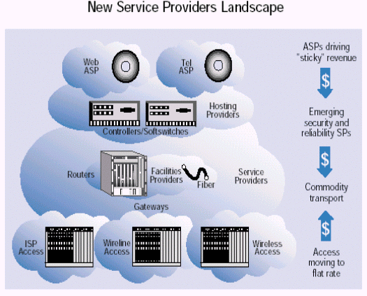 任何一個(gè)網(wǎng)絡(luò)的核心都是光纜和讓網(wǎng)絡(luò)工作起來(lái)的底層交換設(shè)備。傳統(tǒng)的業(yè)務(wù)提供商就是那些擁有這種底層設(shè)備的公司。但是打破傳統(tǒng)的語(yǔ)音環(huán)境為那些沒有這些底層設(shè)備的組織打開了向商業(yè)客戶和消費(fèi)者提供服務(wù)的大門。這種趨勢(shì)--網(wǎng)絡(luò)傳輸從電路交換轉(zhuǎn)變?yōu)榉纸M交換以及隨時(shí)可得的基于開放部件的劃算的業(yè)務(wù)平臺(tái)--使得這些新的業(yè)務(wù)提供商為自己的業(yè)務(wù)找到了商業(yè)機(jī)遇。